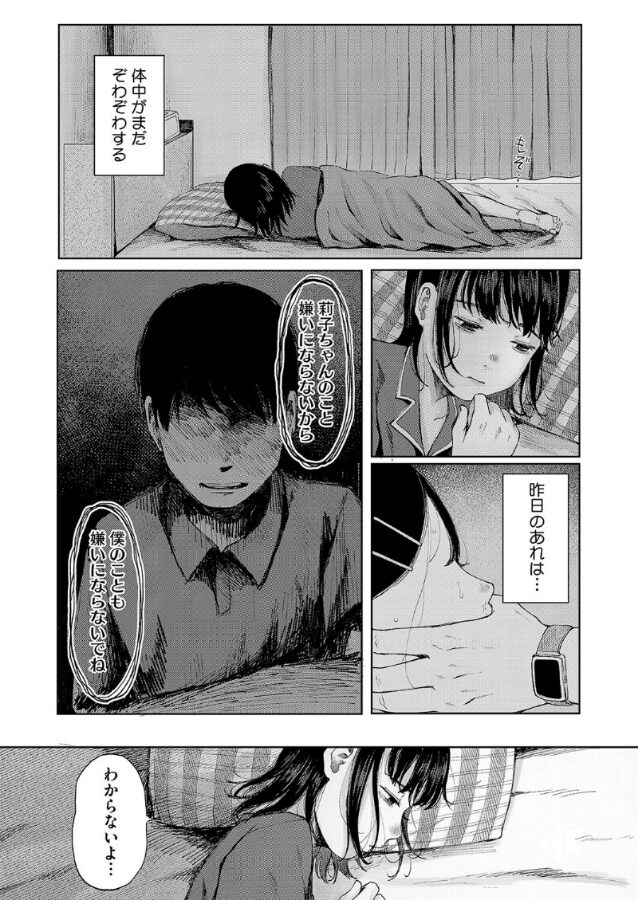塾を早退した日、途中で気分が悪くなった莉子は自分に付き添ってくれた拓海に公園のトイレで介抱されていた。しかし、莉子の涙でくしゃくしゃになった表情に欲情した拓海に無理矢理犯●れてしまう。その後、別れ際の拓海の言動に莉子は混乱しながらも、母に促され塾に行くことに。教室で拓海から渡されたプリントに「授業のあと話したい」とメモが付いていて──。