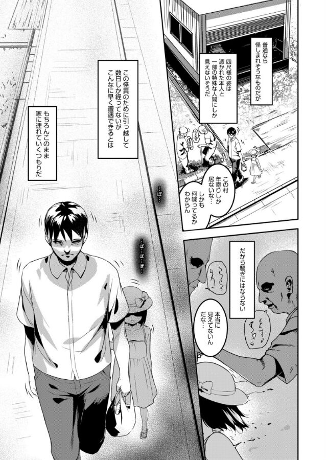 ××村に小さな女の子の怪異がいて取り憑かれた本人と一部の特殊な人間にしか見えないそうだ。人間ではないし怪異なら犯しても犯罪にならない、というやましいキモチでわざわざ引っ越してきて、都合よく憑かれ、部屋へ連れこめた。さっそく裸にしエロい事を始めるが、ち●ぽだけはギンギンなのに体にチカラが入らない…。