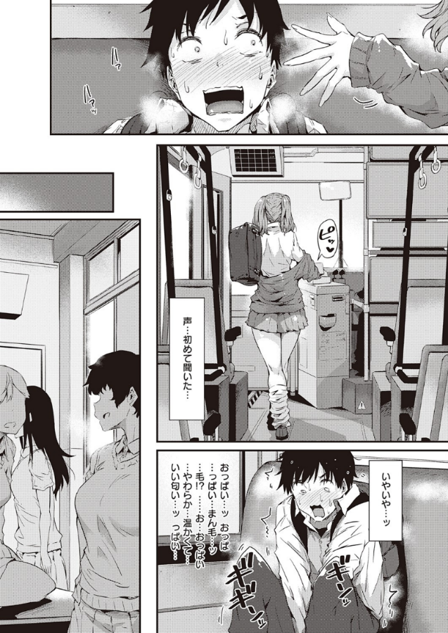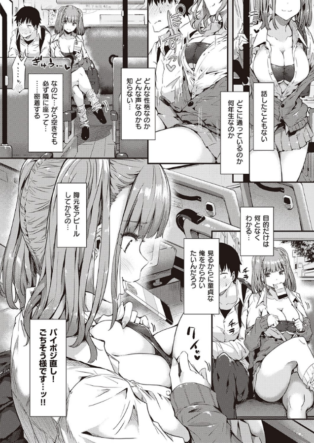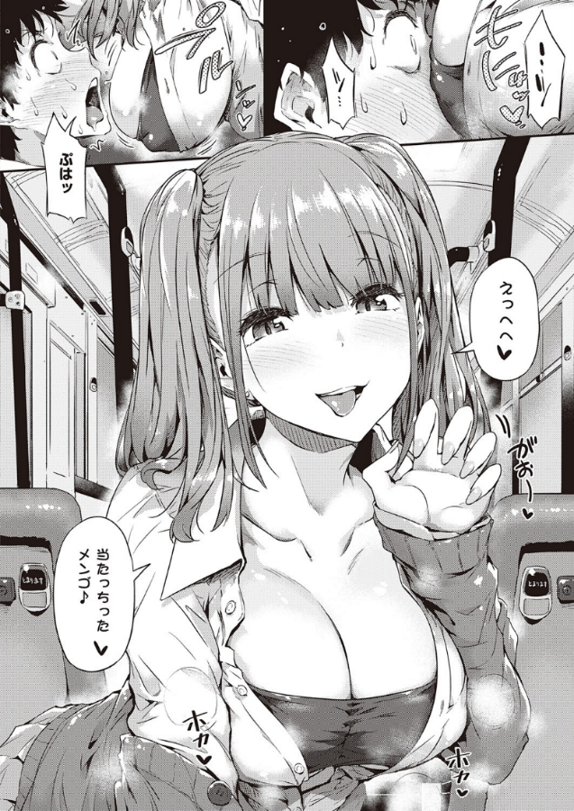朝のバスでいつも俺の隣を陣取る、名前も知らない爆乳ギャル!なんと今日はパイポジ戻しにパンツ見せ、ついには下車ボタンを押すためにおっぱいを俺の顔に押し付けてきた――!おっぱいの余韻に耽った帰り道、なんと彼女も同じバスに乗っていて、初めて話しかけられる事態に♪彼女はどうやら俺を誘っていたようで、俺の手を引いてパンツの中に導き、このままイケるとこまでランデヴー…!?常磐緑先生描く、おっぱい重量級なハーフツインテギャルと、バスの車内で触り合いっこ!