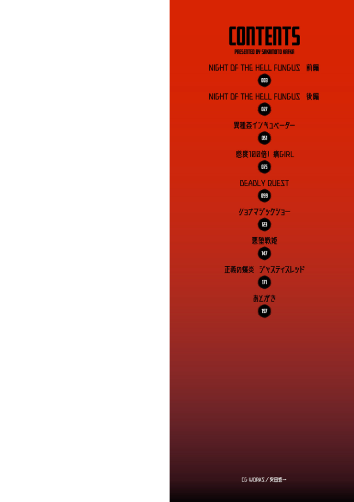 『私はこんな風に死にたくない!!』絶体絶命の状況に追い詰められた少女たちのエロスとタナトスの煌めきを活写した待望の著者初単行本!!醜悪なキノコ人間たちに取り囲まれた山小屋に立て籠る絶体絶命の少女たち。迂闊にも未知の宇宙生物に寄生されてしまい苗床となって死ぬことも出来ない少女。反社会的マッドサイエンティストに誘拐され痛覚を100倍にさせられてしまった強気少女。入った者は二度と帰ってこない洞窟内で魔物に襲われて全滅する冒険者パーティー。軽い気持ちで引き受けたマジックショーのアシスタント役バイトで地獄に堕ちる少女。街の人間を守る正義の少女が敗北し、醜い蟲の化け物に変貌して悪堕ちする屈辱。悪の3人娘が正義マンの過剰な正当防衛で衆人環視のなか完全粉砕処刑される惨め。少女たちの残酷な運命を活写するリョナ特化型アンソロジー《リョナキング》に掲載された作品群を収録した阪本KAFKA初単行本!!【収録作品】・NIGHT OF THE HELL FUNGUS 前編・NIGHT OF THE HELL FUNGUS 後編・異種姦インキュベーター・感度100倍! 痛GIRL・DEADLY QUEST・リョナマジックショー・悪堕戦姫・正義の爆炎 ジャスティスレッド全8作品収録