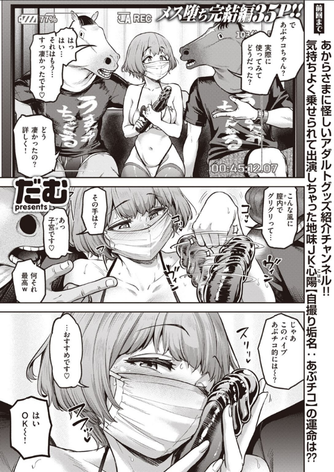 (少し見えちゃってるくらいなら……良いよね……)SNS経由で声をかけられ、アダルトグッズ紹介チャンネルに出演することになった地味JKの心陽(こはる)。疼くような欲求に我慢できず、カメラに向かって自分から乳首を見せつけてきたり、膣内カメラで撮られることを許してしまったり……。1度きりしかない特別な初体験も、恥ずかしげもなく全世界へナマ配信!!挙句の果てには、まんまと乗せられ、複数人から膣内射精されてしまい――!?止まらない承認欲求!! はたして裏アカ処女の運命は……!?