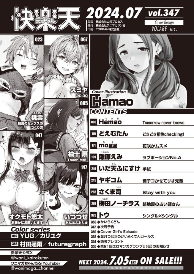 表紙&巻頭はHamaoの描く、感度抜群!! 乳首とろけるオトナ交尾♪じっくり焦らされるのが気持ちいい……!? NGなしの赤裸々ガールズトーク!!「焦らされた分すごく感度良くて めちゃくちゃ気持ちいんだけど――」じっくりたっぷり乳首責め♪ 巻頭はHamao『Tomorrow never knows』付き合う男に趣味を合わせてしまうタイプの女のコ・かれん。気の置けない友達との飲み会ガールズトークが弾み、かれんは年上のカレとのねちっこくてゾクゾクするようなエッチを語りはじめる。その語りは徐々にエスカレート、赤裸々な内容になっていき――「今日の為に頑張ったんですよ♪ 膣・ト・レ」溜め込んだ性欲の解放!! 注目は、桃雲『最高のセックスのつくり方』合格祝いは≪人生で一番気持ちいいセックス≫。部活引退後、SEXに夢中で成績が急落したいつきに、カノジョの遥(はるか)は志望校合格のため、SEXの禁止を提案する。半年後、無事合格したいつきを、ご褒美のためだけに仕上げた身体でお迎えして……ちょっと強引に、時にはアブノーマルに……♪ 他にも、女のコたちのエッチな一面が爆発しちゃう作品が目白押し!!真面目なカノジョと、まだ利用者がいる図書室で♪ ……オクモト悠太『お静かにお願いします』元気で健気な後輩の意外な性癖。人気のない倉庫で強引にされたくて♪ ……スミヤ『20:30』アプリで知り合った女のコ。友達を含めて相性チェックの複数プレイ!? ……どえむたん『どきどき相性checking!』噂のセクハラマッサージ店に潜入!! 証拠を掴んで通報するつもりだったのに……いつつせ『あんあんあんま』誰にも言えない禁断の関係!! 兄妹でハメまくりの日々 ……いだ天ふにすけ『手紙』同窓会で再会した独身クラスメイトと絶倫SEX ……トウ『シングル×シングル』<表紙作家>Hamao<収録作品>カリユグ/YUGTomorrow never knows/Hamao最高のセックスのつくり方/桃雲お静かにお願いします/オクモト悠太20:30/スミヤTouch Me!!/柚十 扇どきどき相性checking!/どえむたんあんあんあんま/いつつせ花咲かムスメ/moggラブポーションNo.A/雛原えみ手紙/いだ天ふにすけ調子コかせてリオ先輩/ヤギコムStay with you/さくま司路地裏の占い師さん/梅田ノーチラスシングル×シングル/トウfuturegraph/村田蓮爾