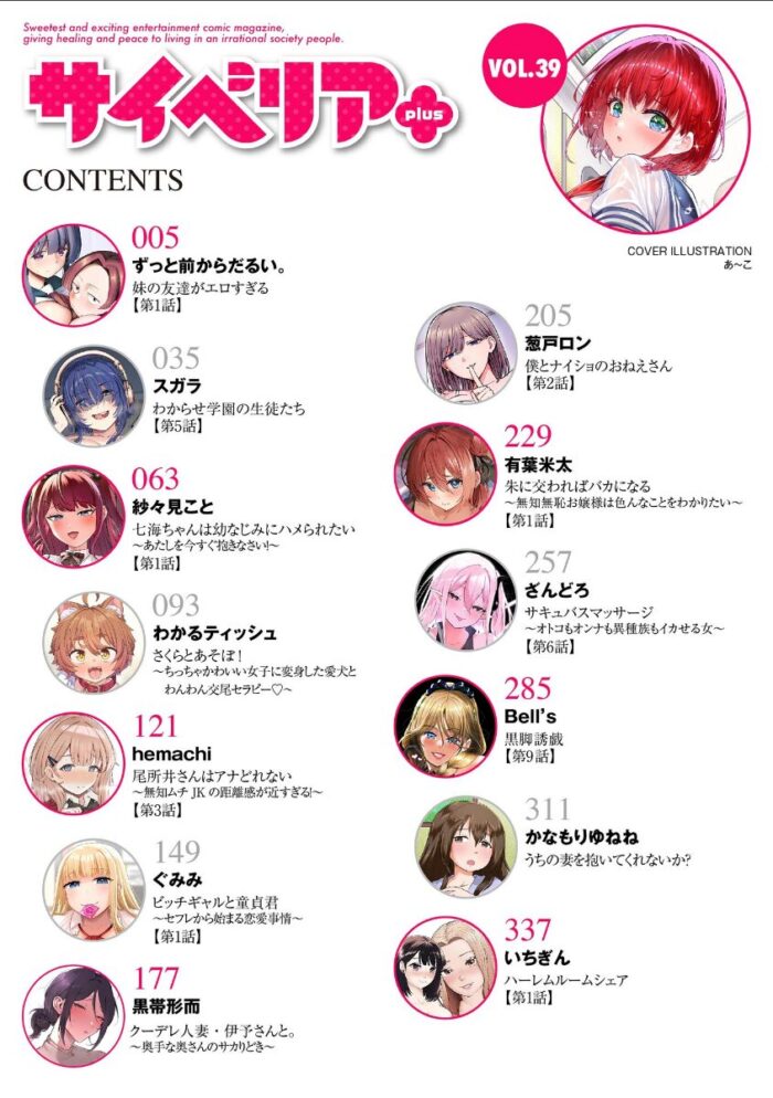 真夏のパーティータイムはレゲエ砂浜ビッグウェーブ!! サイベリアplusにもビッグなニューウェーブがやってきた! 読み切り作品ももりもりの13作品ラインナップ!初登場 ずっと前からだるい。は、久しぶりに会った妹の友達がそれは大きく成長していて…な、まさに『妹の友達がエロすぎる』!!もうひとりの初登場、ぐみみの描く『ビッチギャルと童貞君 〜セフレから始まる恋愛事情〜』! 童貞を奪われた男はビッチギャルにも恋をする…!?地味男×陽キャ女に定評のある紗々見ことは、前作に引き続き『七海ちゃんは幼なじみにハメられたい 〜あたしを今すぐ抱きなさい!〜』で明るい女子に性欲ぷっつん!?ルーズギャルといえば有葉米太! 新作は『朱に交わればバカになる 〜無知無恥お嬢様は色んなことをわかりたい〜』! 年下だ! 生意気だ! わからせだ!ほかにもまだまだたくさん要チェックな魅力的な作品が目白押し!!【掲載作品】妹の友達がエロすぎる【第1話】/ずっと前からだるい。わからせ学園の生徒たち【第5話】/スガラ七海ちゃんは幼なじみにハメられたい 〜あたしを今すぐ抱きなさい!〜【第1話】/紗々見ことさくらとあそぼ! 〜ちっちゃかわいい女子に変身した愛犬とわんわん交尾セラピー〜/わかるティッシュ尾所井さんはアナどれない 〜無知ムチJKの距離感が近すぎる!〜【第3話】/hemachiビッチギャルと童貞君 〜セフレから始まる恋愛事情〜【第1話】/ぐみみクーデレ人妻・伊予さんと。 〜奥手な奥さんのサカりどき〜/黒帯形而僕とナイショのおねえさん【第2話】/葱戸ロン朱に交わればバカになる 〜無知無恥お嬢様は色んなことをわかりたい〜【第1話】/有葉米太サキュバスマッサージ 〜オトコもオンナも異種族もイカせる女〜【第6話】/ざんどろ黒脚誘戯【第9話】/Bell’sうちの妻を抱いてくれないか?/かなもりゆねねハーレムルームシェア【第1話】/いちぎん表紙イラスト/あ〜こ(敬称略)