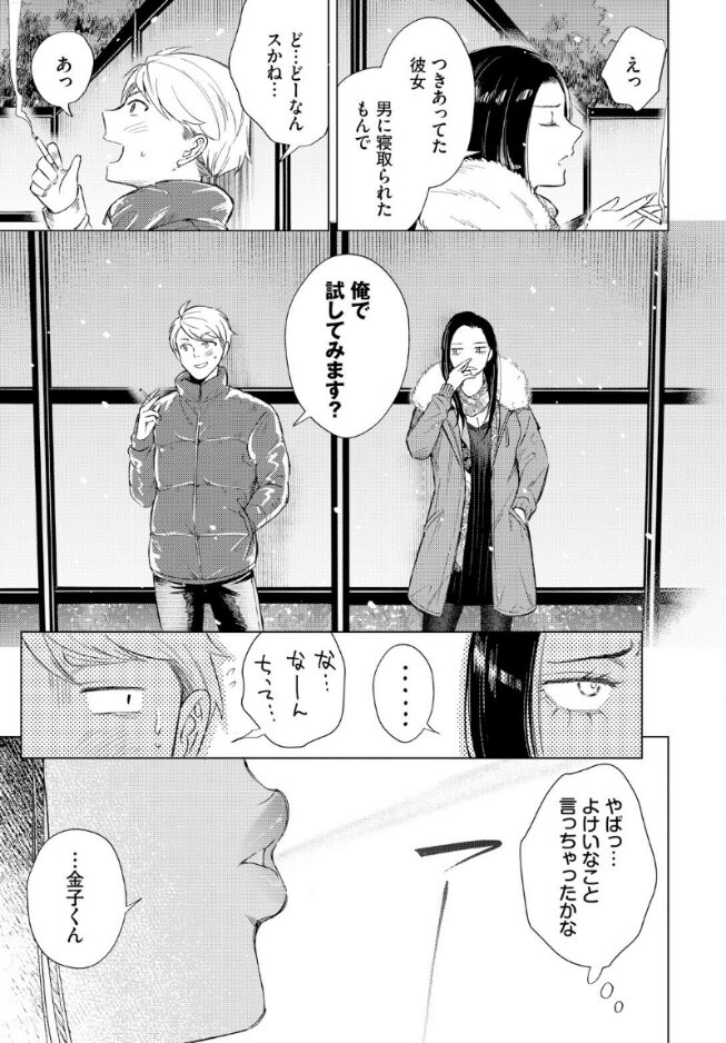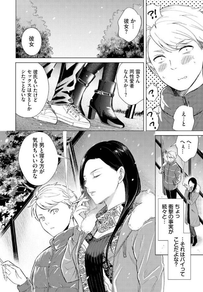 【煙のように儚い…お姉さんとの一夜の恋。】えっちなお姉さんコミッカー ・こーりが描く、クール系美女とのワンナイト♪喫煙所で見かけた美人さんが気になる大学生の金子。その美女・雪と話してくうちに金子は恋に落ちてしまう。ある時喫煙所で久しぶりに雪に会うと彼女と別れたと告げられ、彼女がバイと言うことを知る。男と寝るほうが気持ちいいのかなという雪に、金子はつい『俺で試してみます?』と言ってしまい…!?焦がれ続けた憧れの彼女との甘くほろ苦いSEX譚!