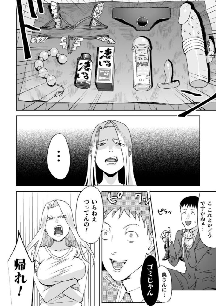 うだつの上がらないエロいグッズ訪問販売営業の男は今日も売れない商品を売るために家庭訪問をしていた。ある日、訪ねた先には生意気そうなヤンキー人妻に強引に営業をかける。商品について詰られ怒り心頭の男は先輩に聞いた催●アプリで人妻に自分が旦那だと思い込ませる。夫だと思った人妻は昼間から今までの塩対応から甘くエッチなおねだりを始めてしまう。途中催●解除された人妻は夫とは違うチンポの味をおぼえこまされて’契約’してしまうのだった。※『二次元コミックマガジン 催●NTR Vol.2』に掲載されている作品です。